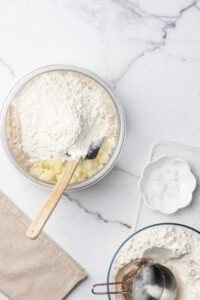In a large bowl, combine mashed potatoes, yeast mixture, melted butter, salt, and two cups of flour.