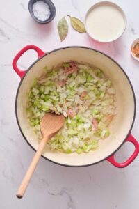 Melt butter in a large pot over medium heat. Add bacon, onion, and celery; sauté for about 10 minutes.