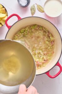 Add the diced potatoes, thyme, bay leaves, and stock. Bring to a boil, then reduce heat and simmer until potatoes are tender, about 15 minutes.