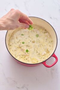 You can make this fish chowder a day ahead of when you plan to serve it—just don’t add the fish. Store it in the fridge, reheat it in a large pot, and add the fish 10 to 15 minutes before serving time. Store any cooked fish chowder leftovers in an airtight container in the fridge for up to 4 days. I don’t recommend freezing this dish, as it could affect the texture of the fish, and the cream and butter could potentially separate upon reheating.