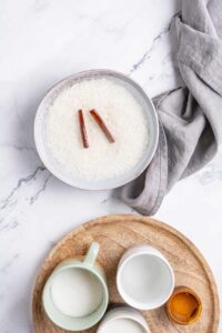 Rinse the rice under running water until the water runs clear. In a large bowl, combine the rice, cinnamon sticks, and 4 cups of warm water. Cover and refrigerate for at least 4 hours or overnight.