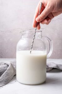 Stir in the cold water, whole milk, sugar, and vanilla extract (if using). Mix until the sugar is fully dissolved.