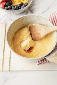 Add cornstarch to the saucepan and cook over medium heat, whisking constantly until thickened. Remove from heat, stir in 1 1/2 tablespoons butter and the vanilla bean paste. Chill in the fridge.