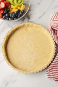 Tart crust is different from pie crust. Tart crust is meant to be more like a big cookie, whereas pie crust is less sweet and more buttery, tender and flaky.