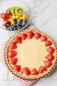 It’s always best to choose fresh fruit over frozen fruit for this recipe. Also, don’t forget the aesthetic part of fruit tart. This means choosing fruits of different colors and textures that are going to complement one another and look good next to each other on top of the tart.