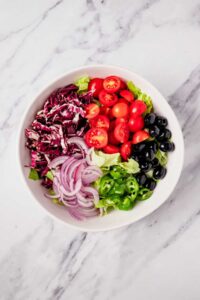In a large salad bowl, combine chopped romaine lettuce, radicchio, sliced red onion, halved cherry tomatoes, pitted black olives, and sliced pepperoncini.