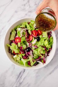 If red wine or balsamic vinegar aren’t your favorites, you can experiment with a sweeter one like apple cider vinegar. It’s less sharp and might be more agreeable for kids, too. Otherwise, for a completely different spin, try a creamy Feta Dressing.