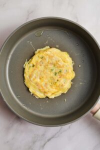 Heat a skillet over medium heat and add enough vegetable oil to coat the pan. Pour 1/2 cup of the egg mixture into the skillet to form a patty.