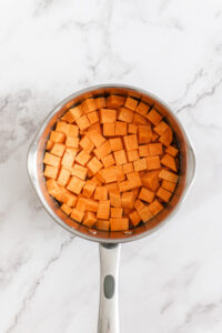 Place sweet potato cubes in a pot, cover with water, add salt, and bring to a boil over medium-high heat. Cook until tender.
