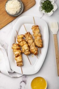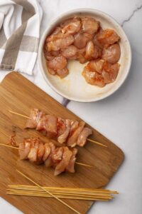 One rule of thumb for this recipe is to give the chicken plenty of space while it’s cooking. For starters, in the air fryer, the skewers should be placed far enough apart so that the pieces of chicken don’t touch. Also, try to cut every piece of chicken breast the same size for even cooking.