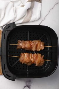 Keep in mind that if you don’t soak the wooden skewers ahead of time, the wood could burn in the air fryer. Soak them for up to 30 minutes before use.