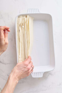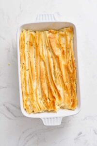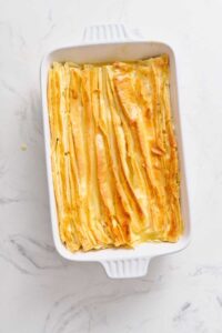Take two sheets of phyllo at a time, crinkle into accordion folds, and place in a greased 9×13-inch baking dish.