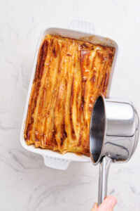 Lemon syrup adds a tangy brightness that balances the rich, buttery layers of the crinkle cake. Its sweet and slightly tart flavor complements the custard-soaked phyllo and enhances the overall taste of the dessert. The syrup also gives the cake its signature moist texture and glossy finish, making it as pretty as it is delicious.