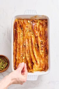 In many ways, this dish is more like a custard pastry than a cake, but each piece strikes the perfect balance between airy and structured, so the name is still apt. Everything comes together to create a flaky yet cake-like slab of nutty sweetness. Thin, phyllo dough is layered sideways in a pan and baked to perfection, then drenched in a smooth custard. The final step is to drizzle a tangy lemon syrup over the cake to make it glisten. Many people top their finished dishes with crushed pistachios or powdered sugar, but there are a surprising number of variations on how to decorate and serve it.