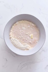 Add unsalted butter and the activated yeast mixture to the flour. Mix using a dough hook on a stand mixer or knead by hand until the dough is smooth and pulls away from the sides of the bowl, about 7 minutes.