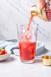 Fill a glass with ice cubes, pour the mixed drink over the ice, and garnish with fresh strawberry slices.