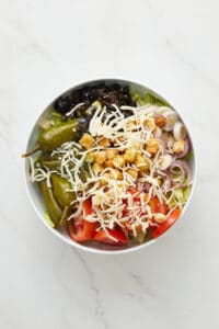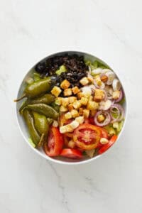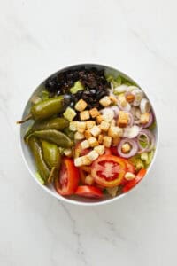Mix lettuce, tomatoes, onions, olives, pepperoncini, and croutons in a bowl.