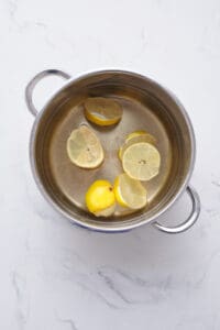 In a large pot, add water, salt, vinegar, and lemon slices. Bring the mixture to a simmer over medium heat.