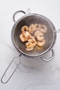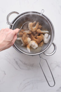 Add the shrimp to the basket and toss shrimp with Old Bay seasoning.