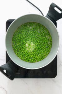 Add the frozen peas and vegetable broth to the pot. Increase the heat to bring the mixture to a boil.