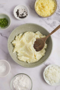 In a medium bowl, mix together the mashed potatoes, egg, flour, salt, pepper, yellow onion, cheese, baking powder, and chives until well combined.