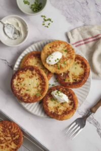Mashed potato pancakes aren’t nutrient-dense or especially healthy, but they do make a good treat once in a while. If needed, you can make them dairy-free by using plant-based sour cream and cheese. To make this recipe gluten-free, simply use an all-purpose gluten-free flour.