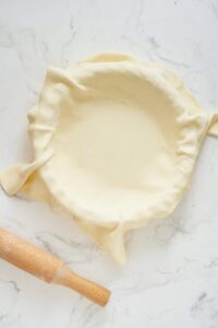 Roll out puff pastry on a floured surface. Place in a pie dish, letting the extra pastry drape over the sides. Add filling, and fold extra pastry back over the filling (it should only cover the edges). Whisk the remaining egg and brush over the pastry.