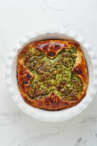 If you’d like to prep the spinach pie ahead of time, simply follow steps 1 through 4 and then cover and store in the fridge for a day. Bake when you’re ready, according to the final step. Store cooked leftovers in an airtight container for 2-3 days in the fridge. For longer storage, cover the pie with aluminum foil and freeze for up to 2 months. Let it thaw in the fridge overnight before reheating in the oven at 350°F until it’s completely warm.