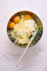 In a bowl, combine cottage cheese, Parmesan, onion powder, dried parsley, dried oregano, nutmeg, salt, pepper, and 3 eggs. Add drained spinach, sautéed onion, and garlic. Mix well.