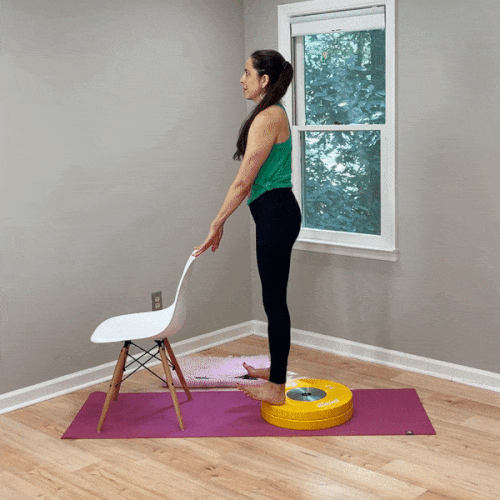 In the second example, I’ve set up with my heels on two stacked weight plates and my hands resting lightly on a chair in front of me for balance help. I start with my toes on the ground (ankles in plantarflexion) and then I lift my feet up and lower them back down again with control.