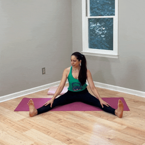 I like performing ankle circles in a straddle seat because I can easily place my hands on my thighs and make sure that my leg holds still while my ankle joint truly mobilizes. (This is a very similar strategy to the wrist circles on the yoga block stack in the previous exercise!)