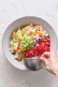 Pour the dressing over the pasta mixture and toss to coat evenly. Season once more by adding salt and black pepper to taste.