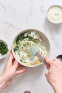 In a separate bowl, whisk together Greek yogurt, mayonnaise, Dijon mustard, celery salt, fresh dill, and lemon juice. Adjust the seasonings to taste.