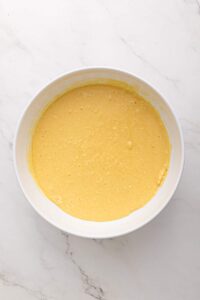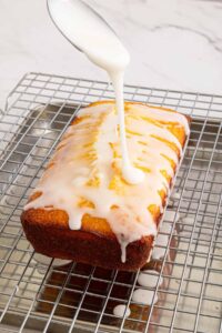 Mix powdered sugar, lemon juice, and milk to make the glaze. Start with 1 tablespoon of lemon juice and slowly add more until you reach your desired consistency. Drizzle over the cooled cake.