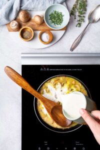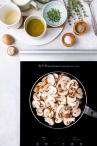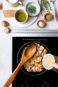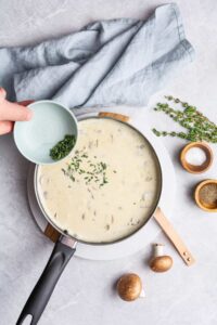 This mushroom sauce is a well-cooked combo of cremini mushrooms, garlic, veggie broth, heavy cream, and white wine, seasoned with salt, pepper, and fresh thyme. Although it takes 25 minutes to make, it won’t be long before the kitchen smells like a garlicky paradise.
