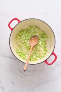 In a large pot, melt butter and sauté onions, celery, and garlic until softened.