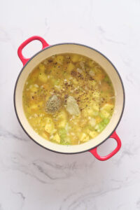 Add potatoes, broth, bay leaves, salt, cumin, oregano, and pepper. Bring to a simmer until potatoes are tender, about 10-15 minutes.