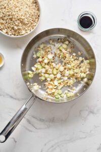 Push the vegetables to one side of the skillet. Add the cooked brown rice to the other side, breaking up any clumps with a spatula.