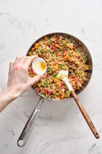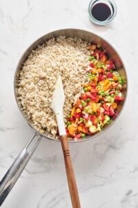 Drizzle 2 tablespoons soy sauce over the rice and mix well. Add 1 more tablespoon if preferred. Combine the rice and vegetables together, stirring well.