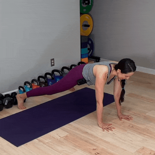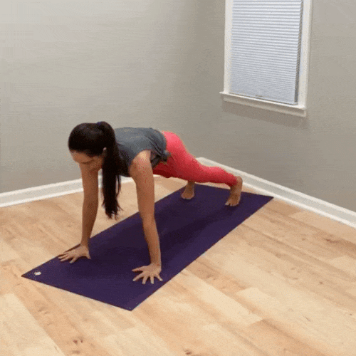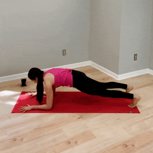 In this surprise plank variation, we start in forearm plank (forearms down) and then we bend our knees and *spring* up into plank pose (hands down)!