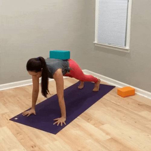 In this variation, we place a block on our low back/pelvis and then step our feet back and forth between plank pose and bear position.