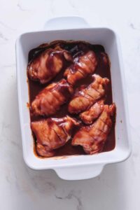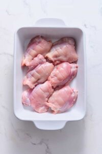 Place the chicken thighs in a square 9-inch baking dish. Score the chicken with a knife.