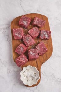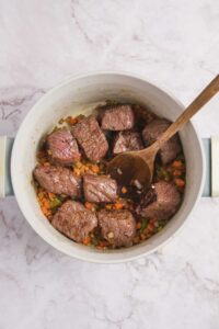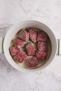 Brown for approximately 4 minutes, flipping halfway. Move to a plate, pour in 1 more tablespoon of olive oil to the pot, and continue with the other half of the beef.