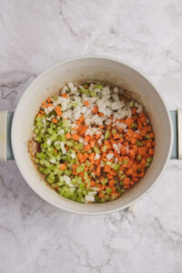 Add more oil to the pot if needed, then add onions, carrots, and celery, and sauté for a few minutes. Add garlic and sauté for 1 minute longer.