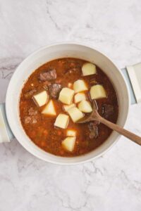 Add potatoes then continue to simmer, covered, 15-20 minutes. Stir in green beans and simmer 15 minutes longer, or until all of the veggies and beef are tender.