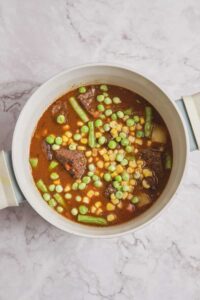 Personally, I see this recipe as a universal family favorite. It’s got a little something for everyone, from succulent beef to soft potatoes and carrots. Plus there are the green beans, corn, and peas – a colorful medley that lightly sweetens the broth and creates a fun texture.