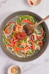Heat oil in a large skillet over medium-high heat. Sauté onion, bell peppers, garlic, and ginger until onion is translucent.