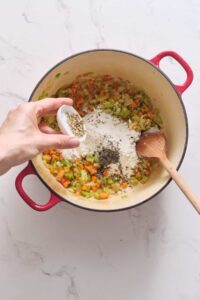 Sprinkle flour, thyme, and fennel seeds over the vegetables and stir to combine. Cook for 2 minutes to remove the raw flour taste.