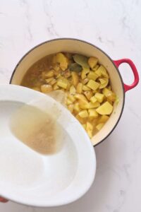 Pour in chicken broth, bay leaves, and add diced potatoes. Bring to a boil, then reduce heat and simmer until potatoes are tender, about 15 minutes.