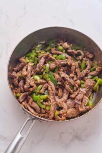 Return the beef, yellow onion, and bell pepper to the skillet.